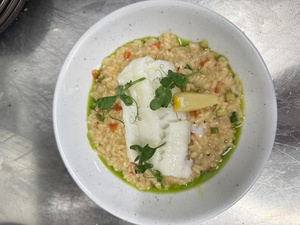 krem z ricotty, pesto bazyliowe, pomidorki confit, bazylia
