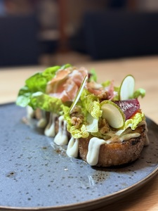 GRUSZKA / PROSCIUTTO CRUDO/ SLICE Z BURAKA / KARMELIZOWANE ORZECHY WŁOSKIE / SAŁATA RZYMSKA / OCET BALSAMICZNY