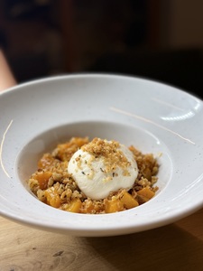 BURRATINA PUGLIESE / ŚLIWKI WĘGIERKI W CZERWONYM WINIE / DYNIA Z SOKIEM Z POMARAŃCZY / KRUSZONKA